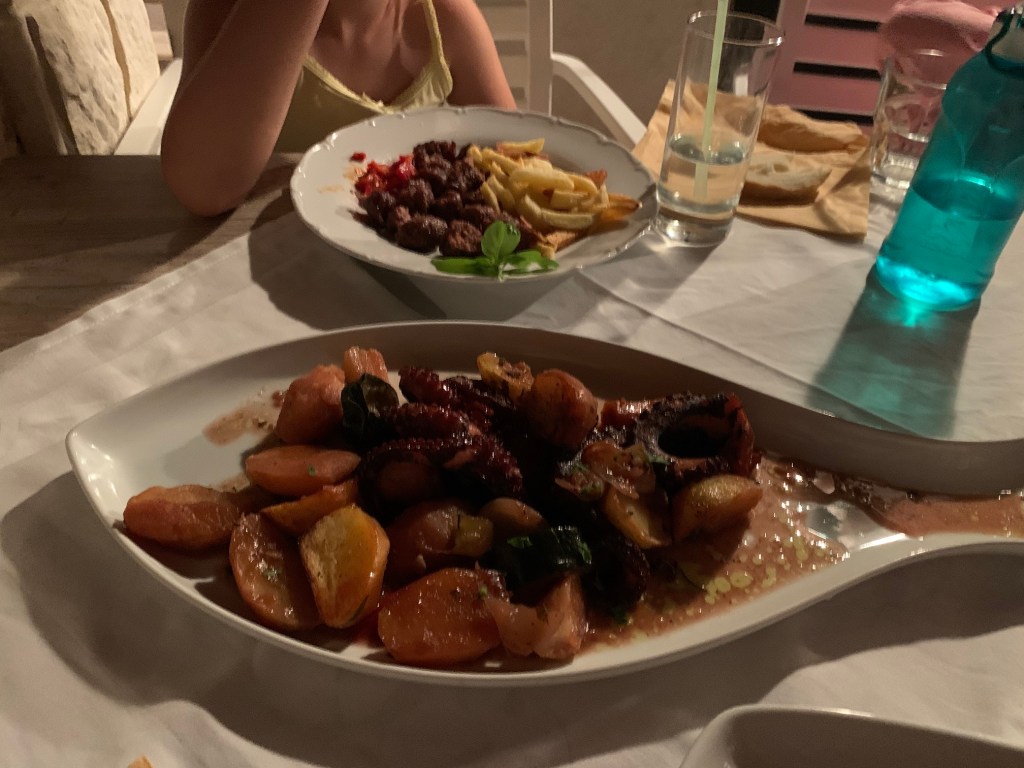 Mieliśmy okazję nocować i jeść w Konoba Santor. Możemy śmiało polecić. Miła obsługa i rodzinna atmosfera, piękny widok z tarasu na zatokę, rozsądne ceny, a wszystkie dania – ośmiornica spod peki, kalmary, dorada, cevapi – świeże i smaczne. W cenie posiłku możemy skorzystać z prądu, wody, a nawet prysznica 🙂